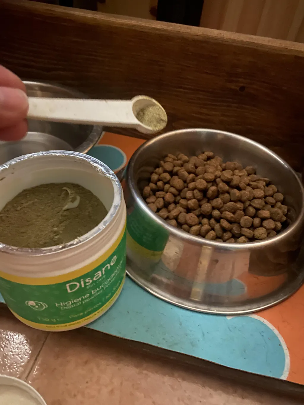 Con la ayuda de la cucharilla, añade la cantidad recomendada al pienso (mojado o seco) y mézclalo.
